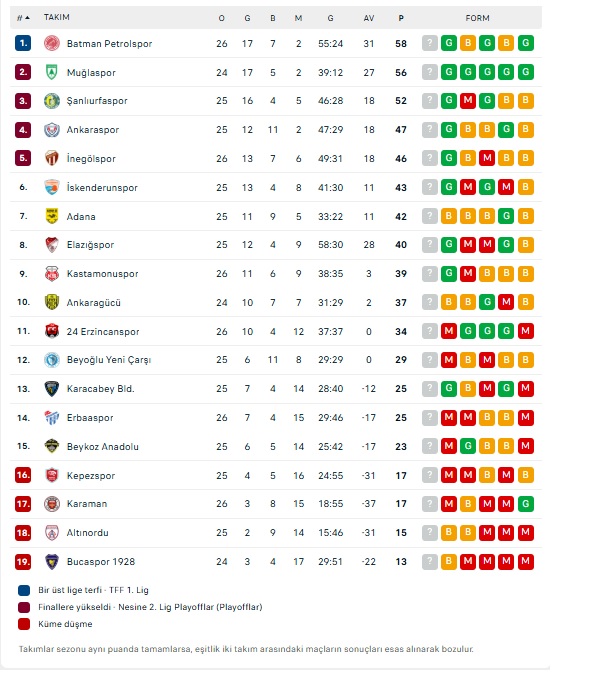 TFF 2.LİG BEYAZ GRUP GÜNCEL PUAN DURUMU