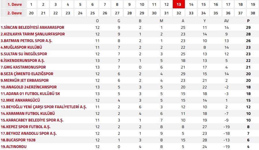 Bu sonuçla 24 Erzincanspor, 13. hafta sonunda puanını 18’e yükselterek ligde 10. sıraya yerleşti.