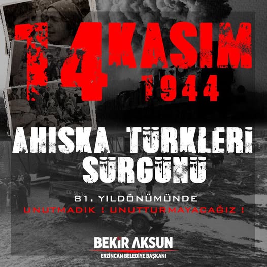 Erzincan Belediye Başkanı Bekir Aksun, 14 Kasım 1944 Ahıska Sürgünü’nün 81. yılında sosyal medya hesabından yaptığı paylaşımda, sürgünde hayatını kaybeden Ahıskalıları rahmetle andı.