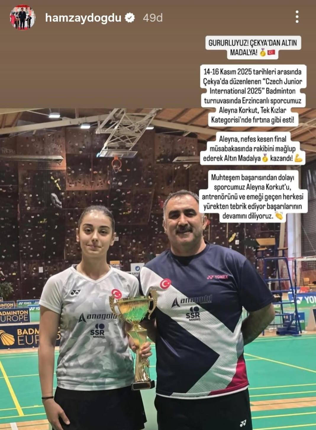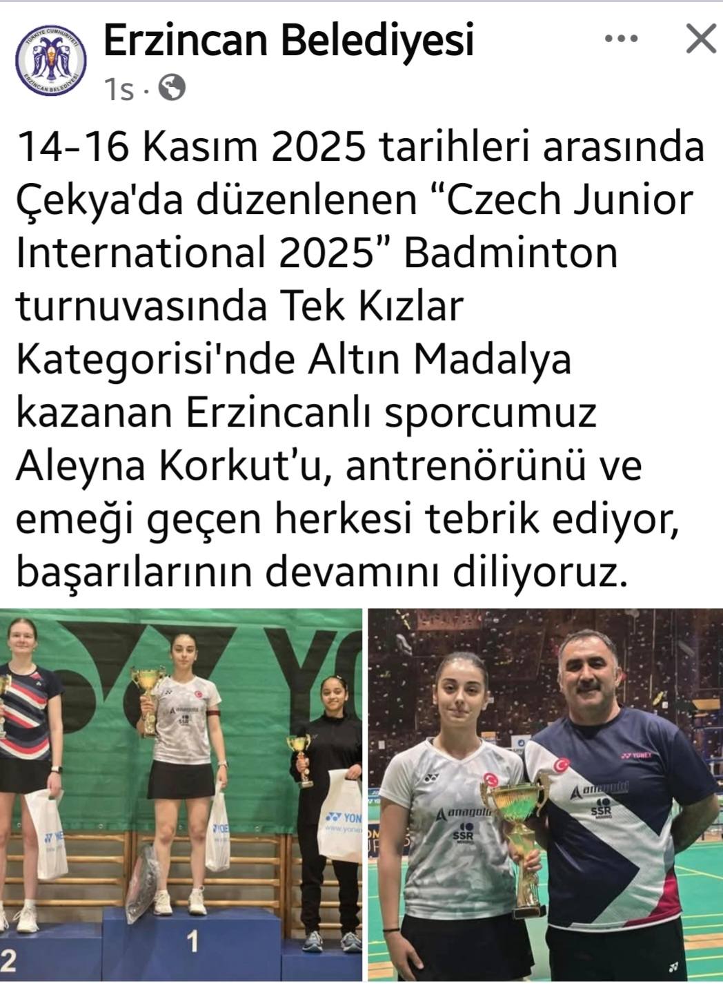Çek Cumhuriyeti’nde düzenlenen Uluslararası Gençler Badminton Turnuvası’nda büyük bir başarıya imza atan milli sporcu Aleyna Korkut, 25 ülkeden 45 sporcunun yarıştığı Tek Bayanlar kategorisinde şampiyon olarak Türkiye’nin ve Erzincan’ın gururu oldu.