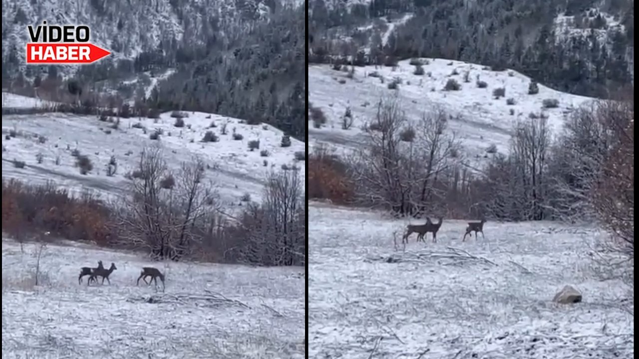 Erzincan’ın Refahiye İlçesi Baştosun köy yolunda kar yağışı altında Karaca Geyikler görüntülendi.