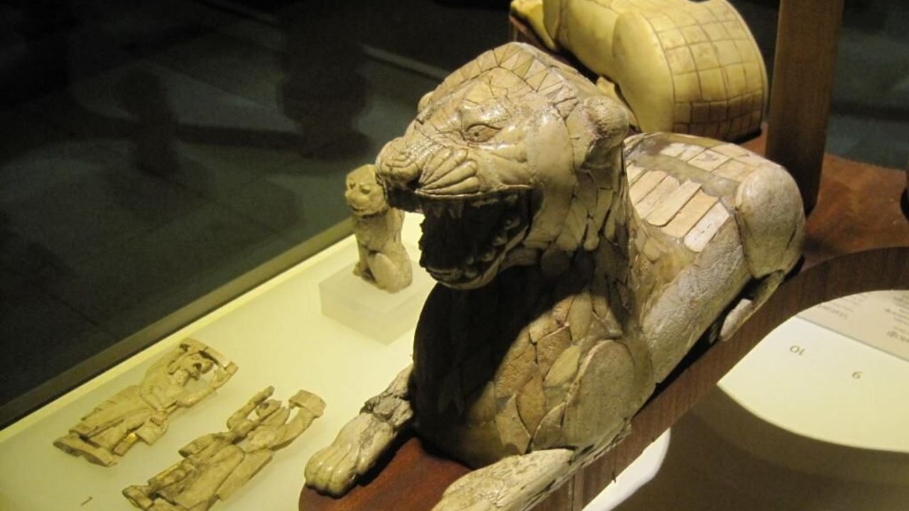 En Büyük Heykelcik: Yüzden fazla fildişi plakanın birleşmesiyle oluşturulan yatar vaziyetteki aslan örneği, Ön Asya’da bulunan fildişinden yapılmış en büyük aslan heykelidir.