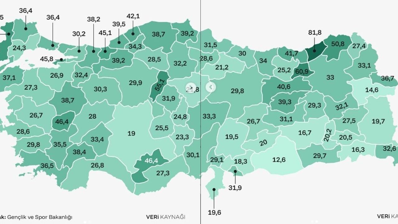 Haritada en yüksek oranlardan biri yüzde 81,8 ile dikkat çekerken, birçok büyükşehirde oranların 30-40 bandında seyrettiği görülüyor. Erzincan’ın 39,3’lük seviyesi, sporun tabana yayılması açısından önemli bir gösterge olarak değerlendiriliyor.