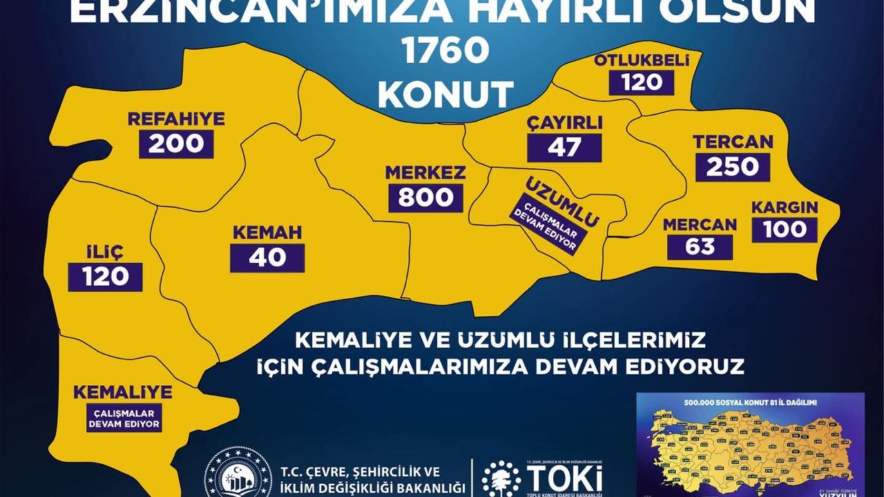Projede en fazla konutun yapılacağı iller İstanbul, Ankara, İzmir, Bursa ve Konya olarak kayıtlara geçti. Erzincan'da ise 1 760 konut yapılacak. Bu doğrultuda 81 ilde 500 bin konutun yükseleceği ilçeler de netleşti.