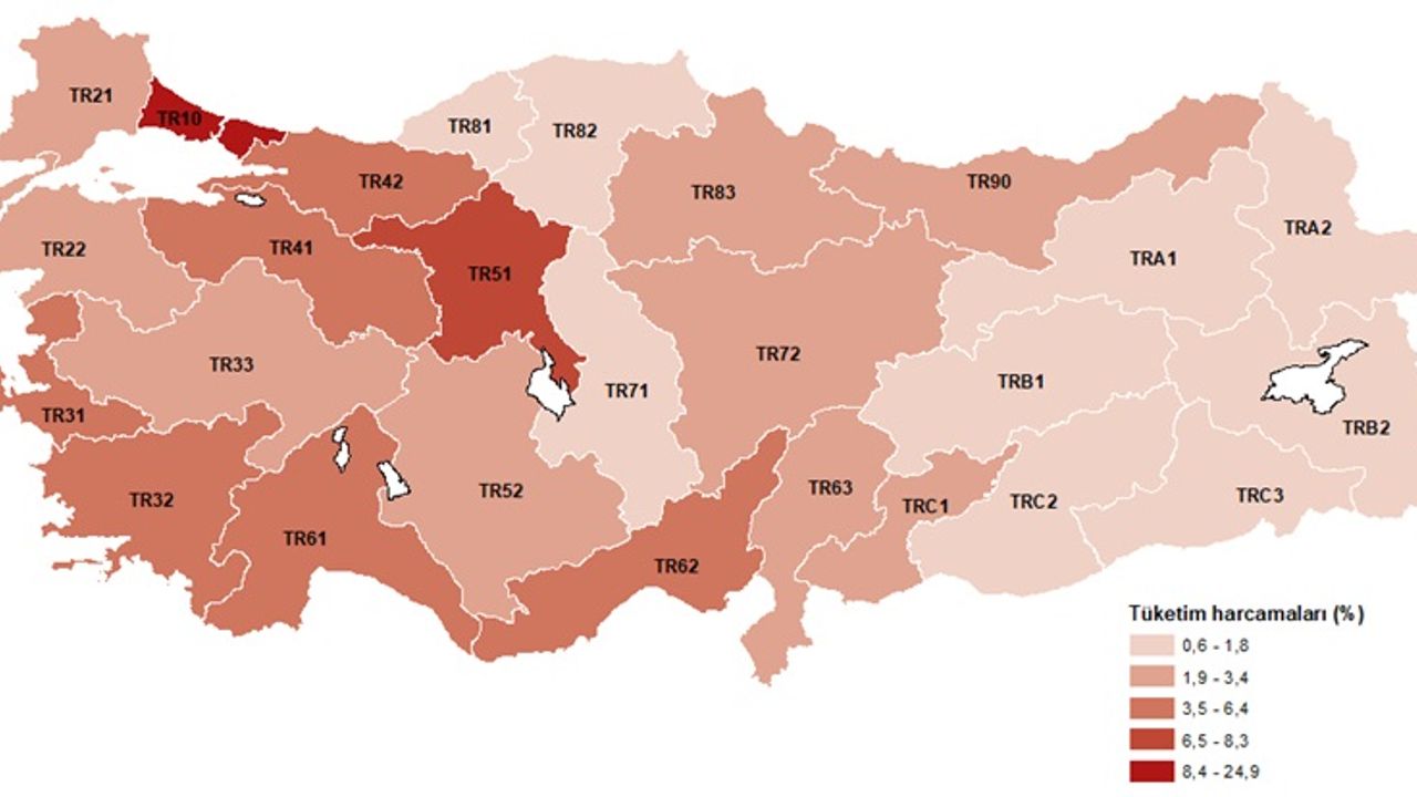 Araştırma sonuçlarına göre İBBS 2. Düzey bölgeleri itibarıyla, Türkiye'deki hanehalkı tüketim harcamalarının %24,9'u TR10 (İstanbul) bölgesinde gerçekleşti. İkinci sırada %8,3 ile TR51 (Ankara) bölgesi yer alırken; bunu %6,4 ile TR31 (İzmir), %5,9 ile TR42 (Kocaeli, Sakarya, Düzce, Bolu, Yalova) bölgeleri izledi.