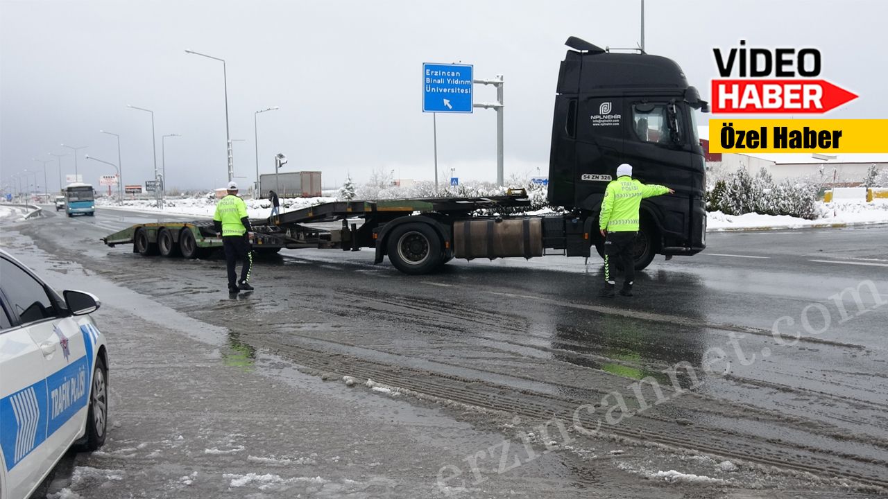 Erzincan’da gece saatlerinde başlayan yoğun kar yağışı ulaşımı olumsuz etkiledi. Üniversite Kavşağı’ndan Sakaltutan istikametine büyük araçların geçişi güvenlik nedeniyle durduruldu.