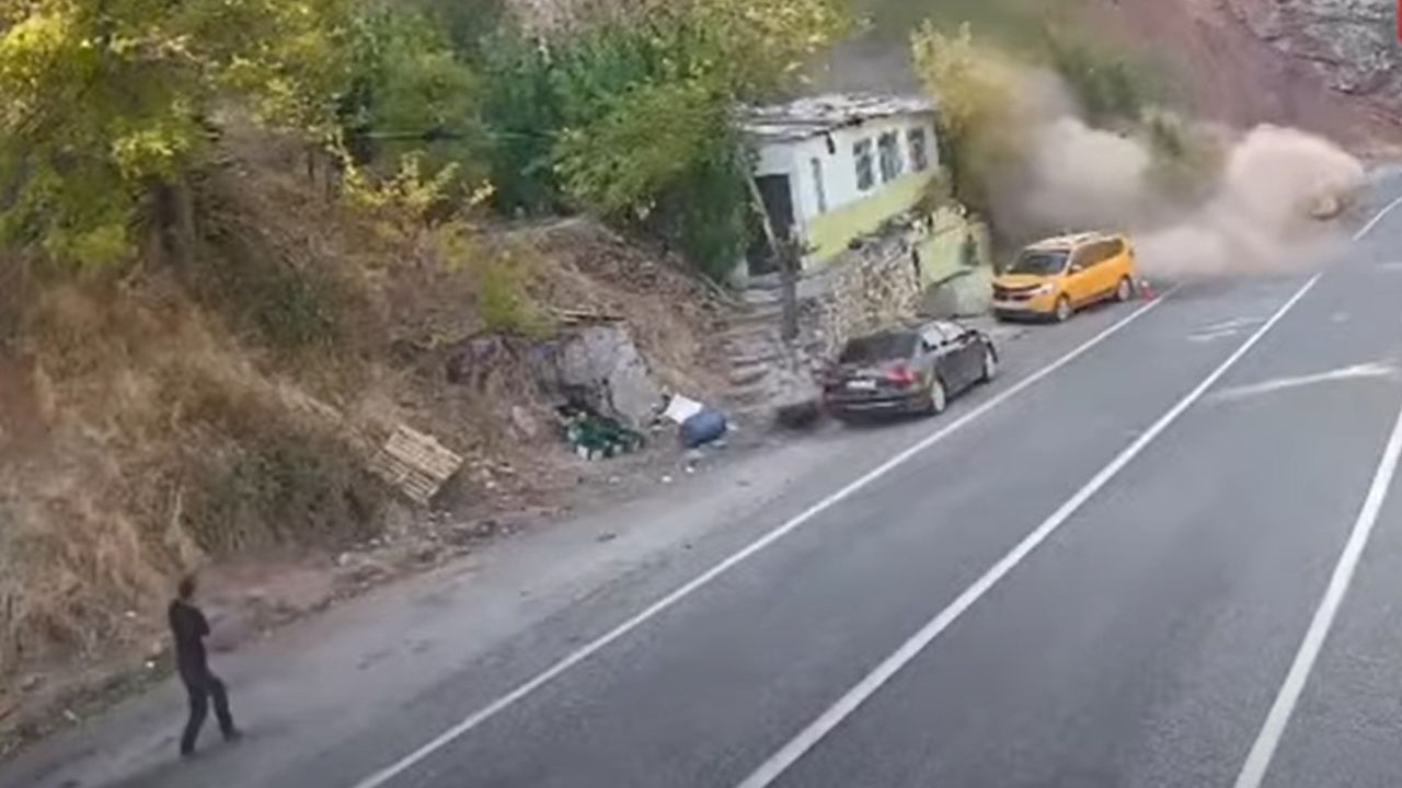 O anlar, bölgedeki bir iş yerinin güvenlik kamerasına saniye saniye yansıdı. Görüntülerde, kayanın büyük bir hızla yola yöneldiği, ancak şans eseri hiçbir araca ya da vatandaşa çarpmadan yolun alt kısmına yuvarlandığı görülüyor.