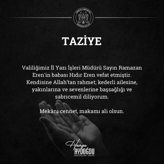 Erzincan Valisi Doç. Dr. Hamza Aydoğdu, yayımladığı taziye mesajında şu ifadelere yer verdi:“Erzincan Valiliği İl Yazı İşleri Müdürümüz Ramazan Eren’in kıymetli babası Hıdır Eren’in vefatını büyük bir üzüntüyle öğrendim.