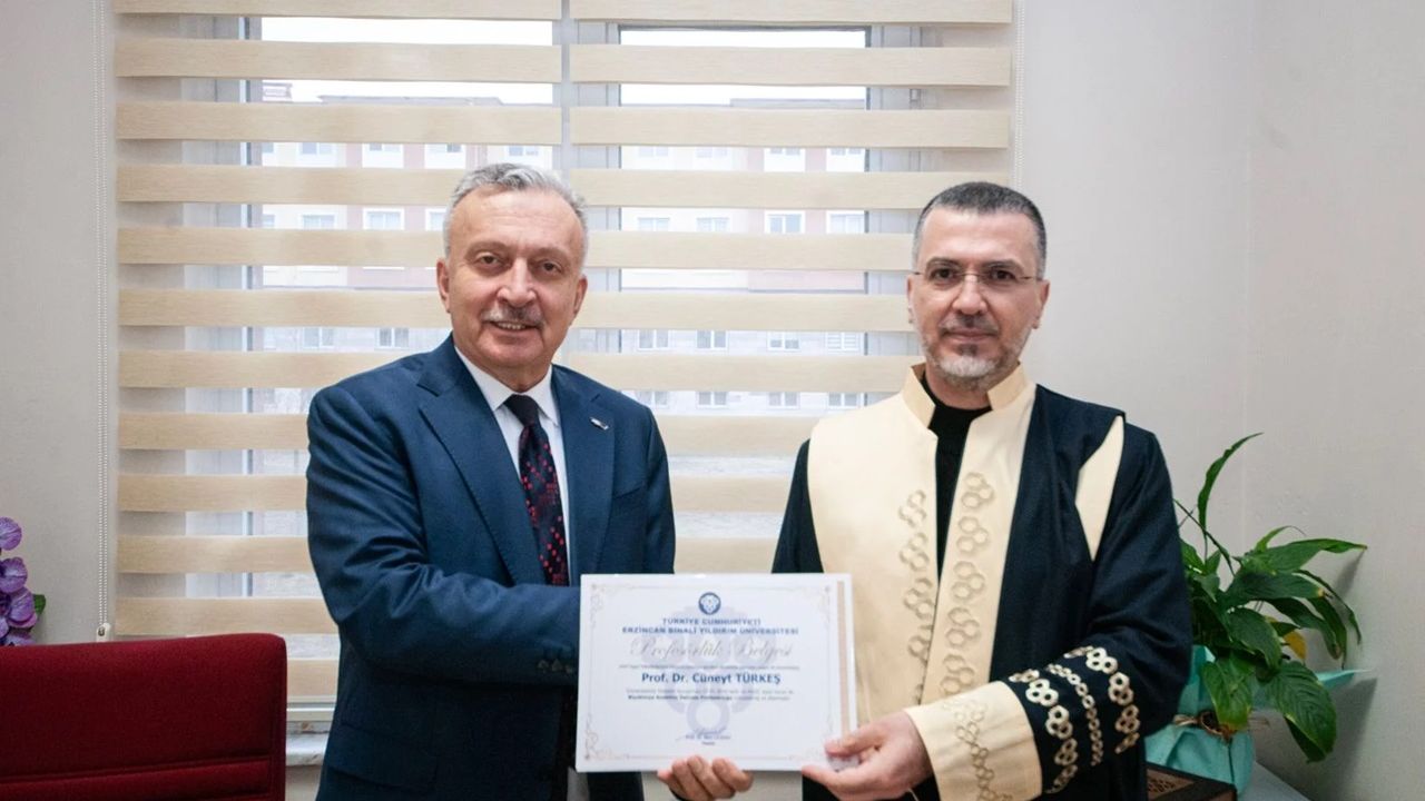 Erzincan Binali Yıldırım Üniversitesi Rektörü Akın Levent, Eczacılık Fakültesi’nde profesörlük ünvanı almaya hak kazanan Cüneyt Türkeş’e hayırlı olsun ziyaretinde bulundu.