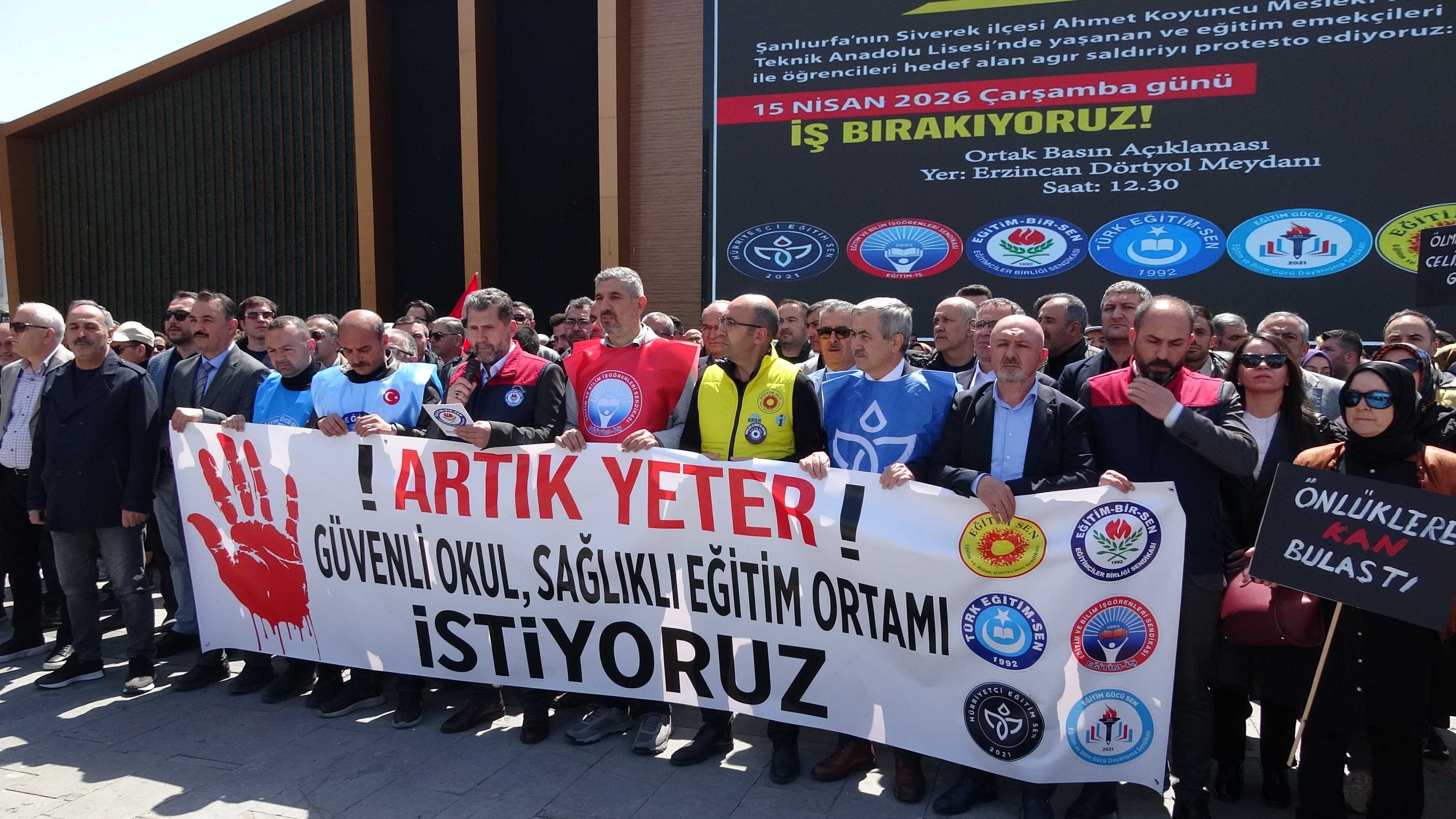Şanlıurfa’nın Siverek ilçesinde bir liseye düzenlenen silahlı saldırıda 16 kişinin yaralanması, ülke genelinde büyük yankı uyandırırken; eğitimciler 15 Nisan’da iş bırakarak meydanlara indi. Erzincan’da da sendikalar ve sivil toplum kuruluşları ortak basın açıklaması yaptı.