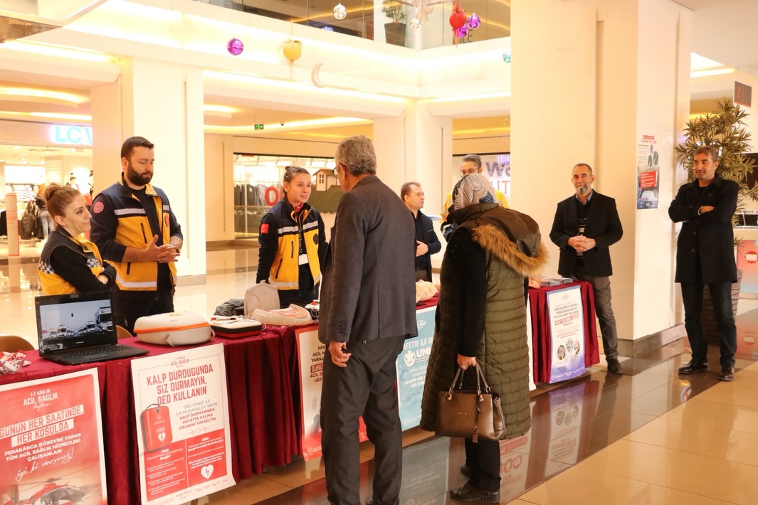 Standı ziyaret eden vatandaşlara, 112 Acil Sağlık Hizmetleri personelleri tarafından Otomatik Eksternal Defibrilatör (OED) cihazı tanıtılarak ani kalp durması durumunda yapılabilecek ilk müdahaleler konusunda eğitim verildi.