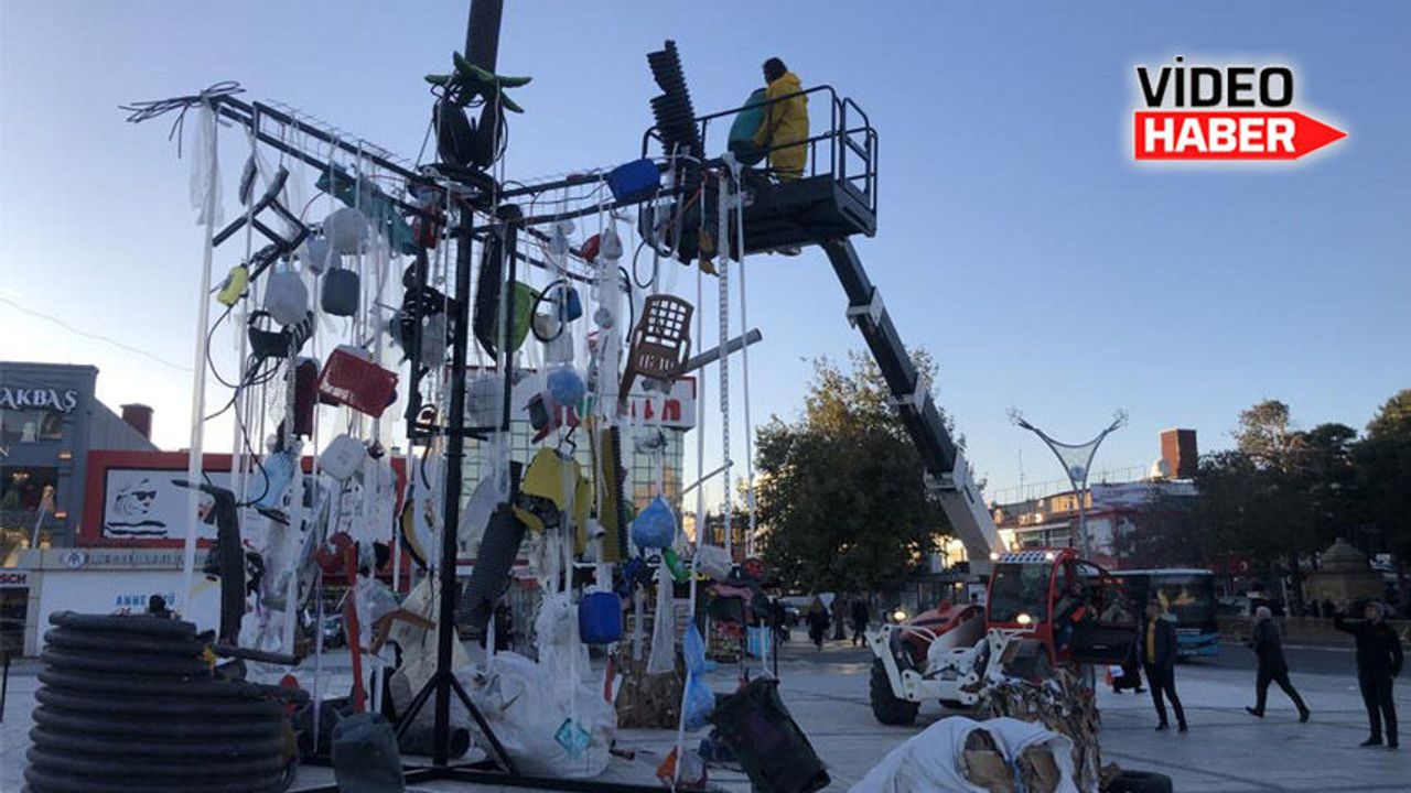 Kavukcu, izmarit, kâğıt, metal, naylon vb. atık malzemelerle oluşturduğu kütleyi, Erzincan Dörtyol Meydanı'na taşıdıktan sonra, metal konstrüksiyonla oluşturduğu bir korkuluk üzerine yerleştirerek çalışmasını tamamladı.