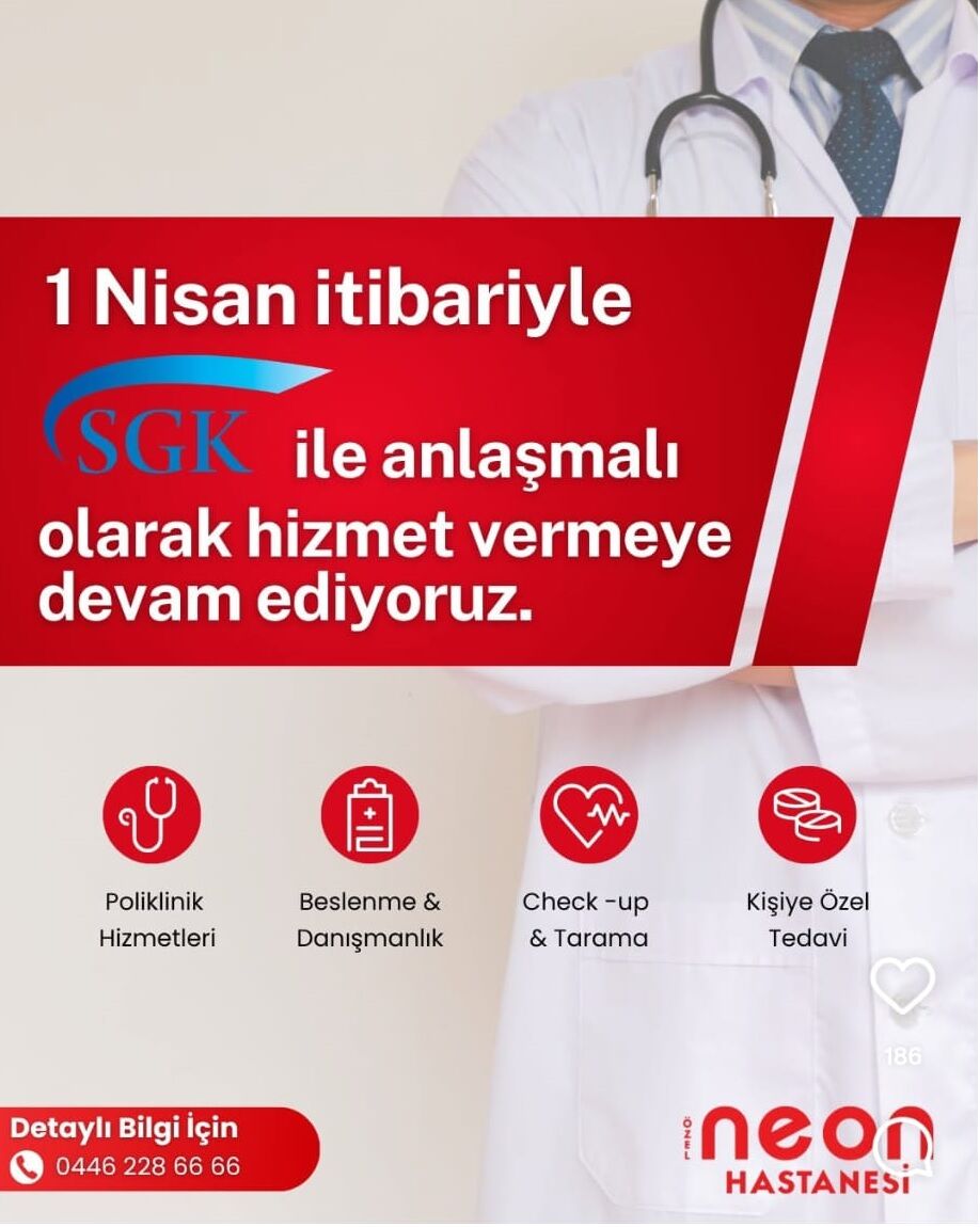 Erzincan’da sağlık alanında önemli bir gelişme yaşandı. Neon Hastanesi, 1 Nisan itibarıyla yeniden SGK ile anlaşmalı olarak hizmet vermeye başlayacağını sosyal medya hesapları üzerinden duyurdu.