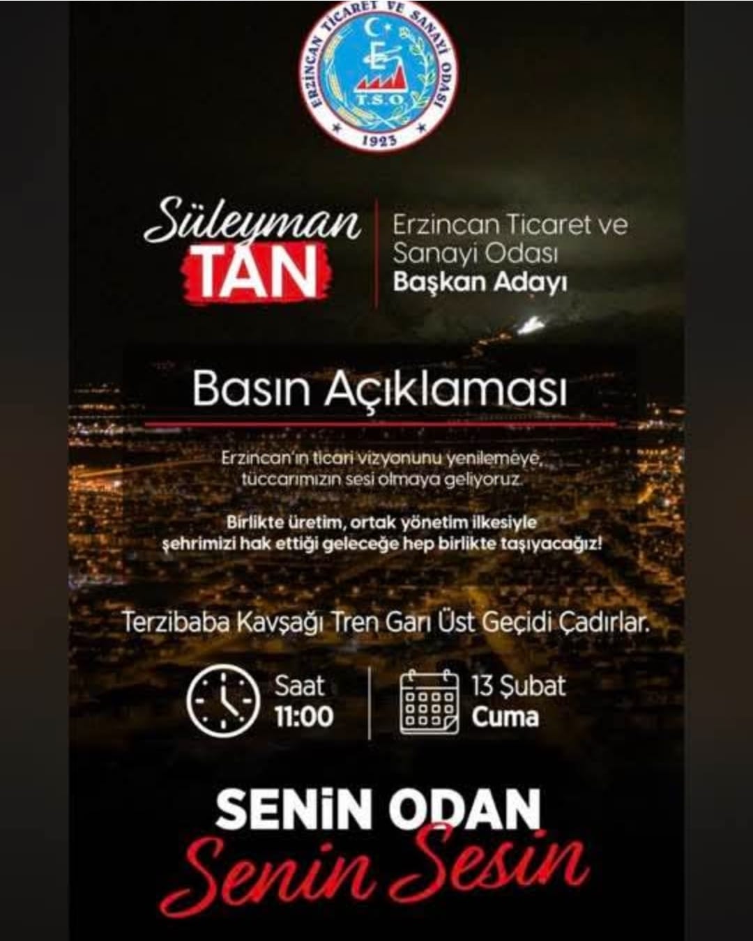 Erzincan iş dünyasının tanınan isimlerinden Süleyman Tan, Erzincan Ticaret ve Sanayi Odası Başkanlığı için adaylığını kamuoyuna duyurdu. Tan’ın adaylığı, şehirdeki ticari çevrelerde yeni bir dönemin habercisi olarak değerlendiriliyor.