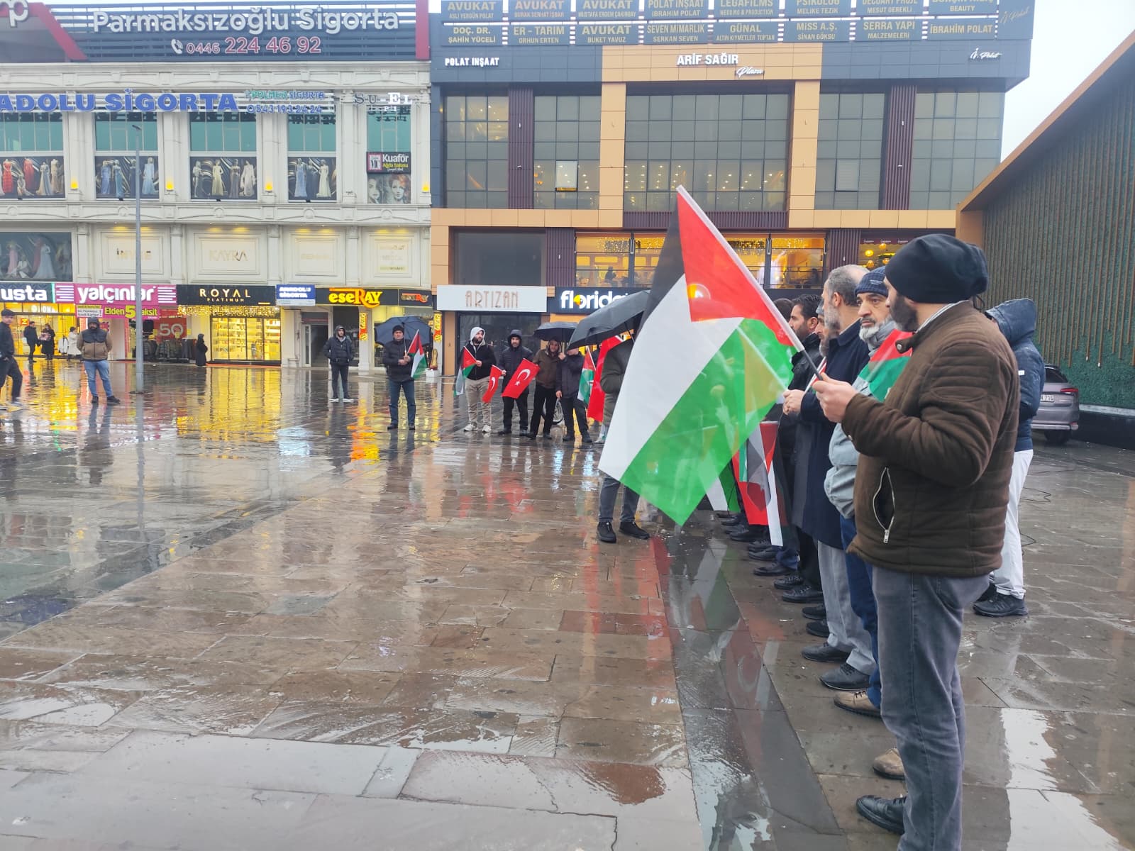 Erzincan’da sağanak yağışa rağmen yüzlerce vatandaş, Filistin’de yaşanan insani krize dikkat çekmek için meydanda bir araya geldi. Erzincan Filistin Dayanışma Platformu öncülüğünde düzenlenen basın açıklaması, duygu yüklü anlara sahne oldu. Katılımcılar ellerinde Filistin bayrakları ve destek mesajlarıyla, özellikle Gazze’de yaşanan sivil kayıplar ve yıkıma dikkat çekti.