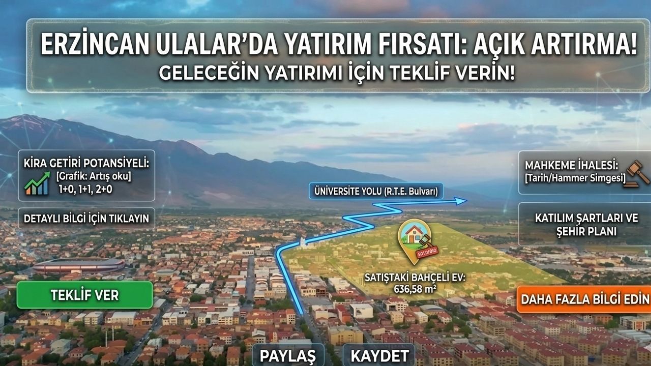 Erzincan gayrimenkul piyasasının yükselen yıldızı Ulalar Özgürlük Mahallesi’nde, hem konumu hem de potansiyeliyle dikkat çeken bir taşınmaz icra yoluyla satışa çıkıyor. Güney Cadde üzerinde yer alan ve Recep Tayyip Erdoğan Bulvarı’na komşu olan bu parsel, yatırımcılar için "altın fırsat" niteliğinde.