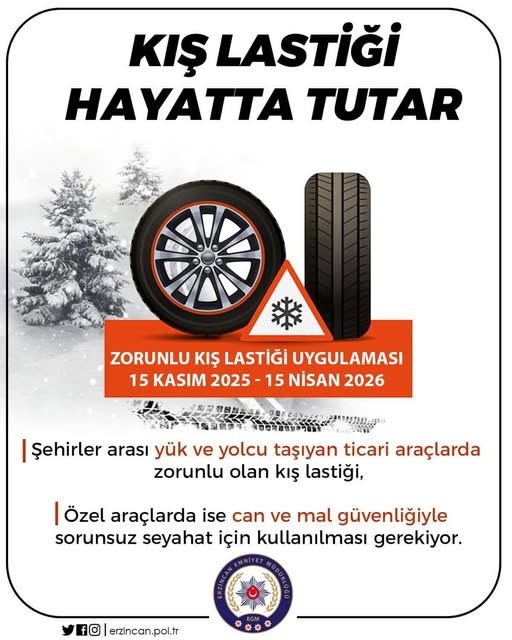 Erzincan Emniyet Müdürlüğü, “Kış lastiği hayatta tutar” mesajıyla kış lastiği uygulamasının 15 Kasım 2025 – 15 Nisan 2026 tarihleri arasında zorunlu olacağını duyurdu. Yetkililer, özellikle şehirler arası yük ve yolcu taşıyan ticari araçlarda kış lastiği kullanımının yasal bir zorunluluk olduğunu hatırlattı.