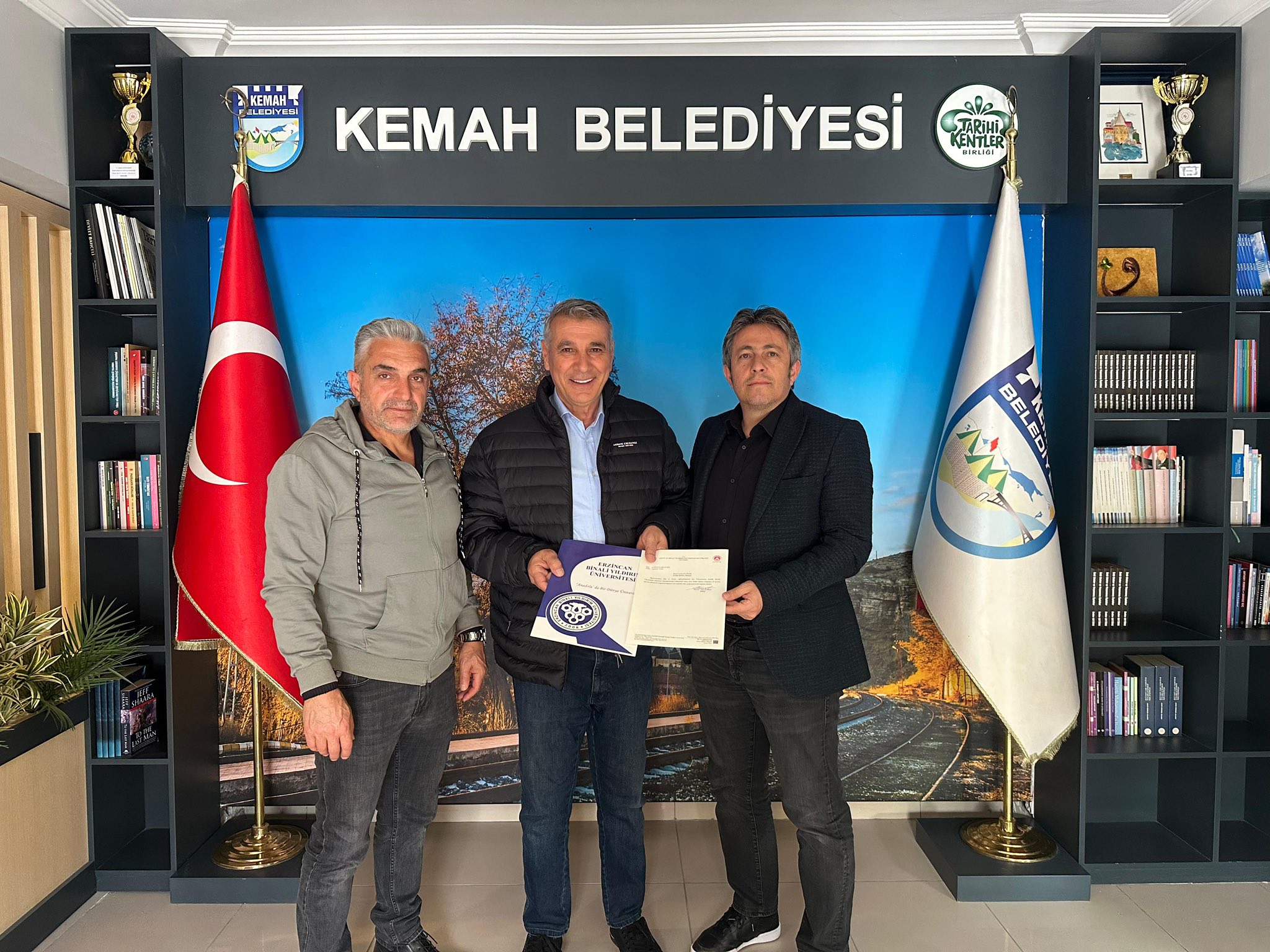 Kemah Belediye Başkanı Cevdet Bayram’a, eğitime sunduğu katkılardan dolayı EBYÜ Rektörü Prof. Dr. Akın Levent, Kemah MYO Müdürü Prof. Dr. Etem Osma ve MYO Sekreteri Selçuk Karakoyun tarafından plaket ve teşekkür belgesi takdim edildi.