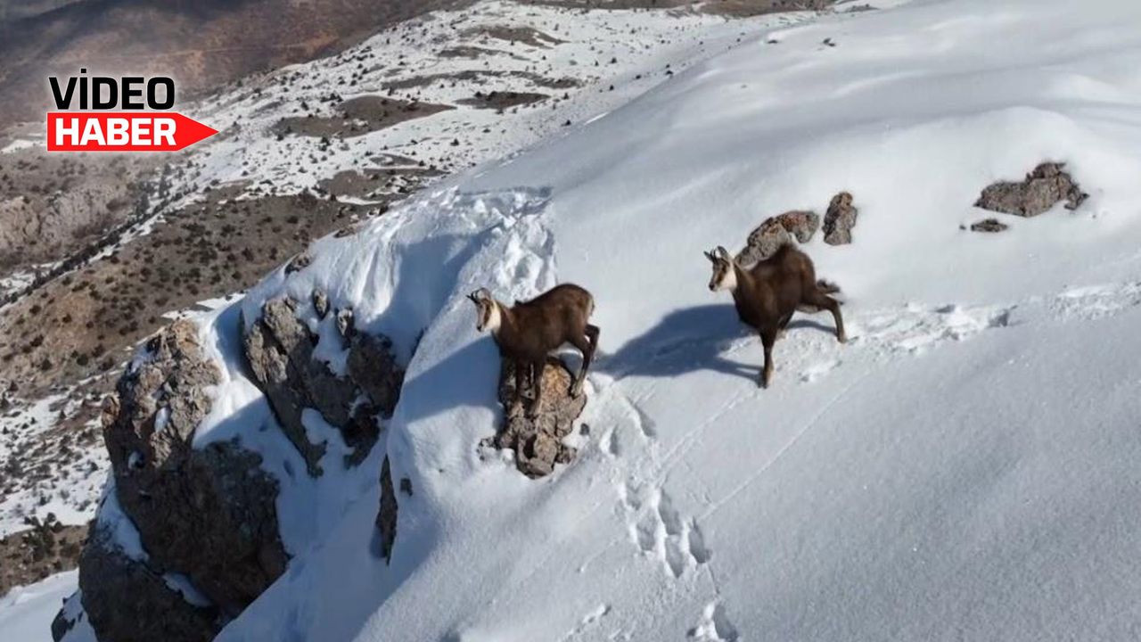 Erzincan ile Tunceli arasında yer alan 3 bin 300 rakımlı Munzur Dağlarında yabani hayvan popülasyonunda artış yaşanırken çengel boynuzlu dağ keçileri (şamua) drone ile havadan görüntülendi.