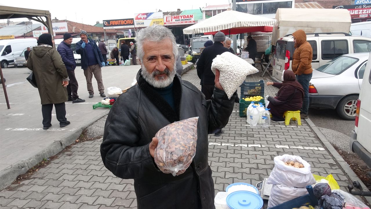 - “Erzincan'ın organik ürünlerini satıyoruz. Tüm halkımızı davet ediyoruz. Kuru kaysımız da var. Bu da yerli Erzincan'ın, Çatalarmut köyünün ürünleri. Hakiki dermasyon. Fiyatı kuru kaysının şu an 250-350 arası gidiyor. Ama satış yok. Fasulye de 250 aynı fiyatta. Başka da bir şey yok. Kasefe yapmak için kayısı iyi satılması lazım ama satışlarımız yok beyefendi. Çeyirdek de, yine bizim Tercan yöresinin Çeyirdeği. O da satış yok 100 lira fiyatına. Bekliyoruz işte halkımızı.”