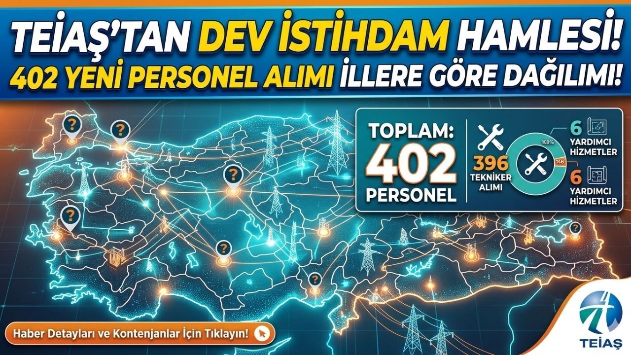 Şirketimiz işyerlerinde çalıştırılmak üzere 09.08.2009 tarihli ve 27314 sayılı Resmi Gazete'de yayımlanan “Kamu Kurum ve Kuruluşlarına İşçi Alınmasında Uygulanacak Usul ve Esaslar Hakkında Yönetmelik” hükümlerine göre 324'ü Elektrik, 40'ı Elektronik, 14'ü İnşaat, 8'i Harita, 4'ü Makine, 2'si Sıhhi Tesisat, 2'si Kimya, 1'i Kaynak ve 1'i Teknik Ressam olmak üzere toplam 396 Tekniker ile yardımcı hizmetlerde görev alacak Önlisans mezunu 3 Aşçı, 2 Resepsiyon Görevlisi ve 1 Garson olmak üzere toplam 6 personel alınacaktır. İşe alınacak personelin unvanları ile çalıştırılacakları iller aşağıda belirtilmiştir.
