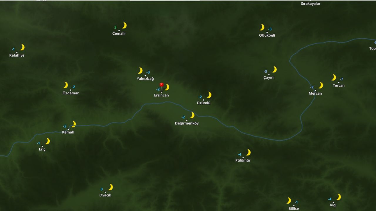 Erzincan'da bu hafta hava sıcaklıklarında düşüş yaşanacak. Bugün serin bir havanın etkisi altında olurken herhangi bir yağış beklentisi ise bulunmuyor. Erzincan'da hava durumunun parçalı bulutlu olması bekleniyor. Bu geceki en düşük sıcaklığın 10°C civarlarında olması bekleniyor. Havanın yağışlı olma ihtimali %0 civarında olurken, Rüzgârın güney doğu 5 km/sa hızında, genellikle sakin ve ara sıra hafif esintili olması bekleniyor. Hava kalitesi orta derecede olacak. Gökyüzündeki bulutların yoğunluğu %76 oranında. Bugünkü hava şartlarında görüş uzaklığının yaklaşık 8 km olacağı tahmin ediliyor. Erzincan'ın nem oranı %60 civarında beklenirken, çiy noktası -5°C ve basınç değerinin 1030 mb olması bekleniyor.