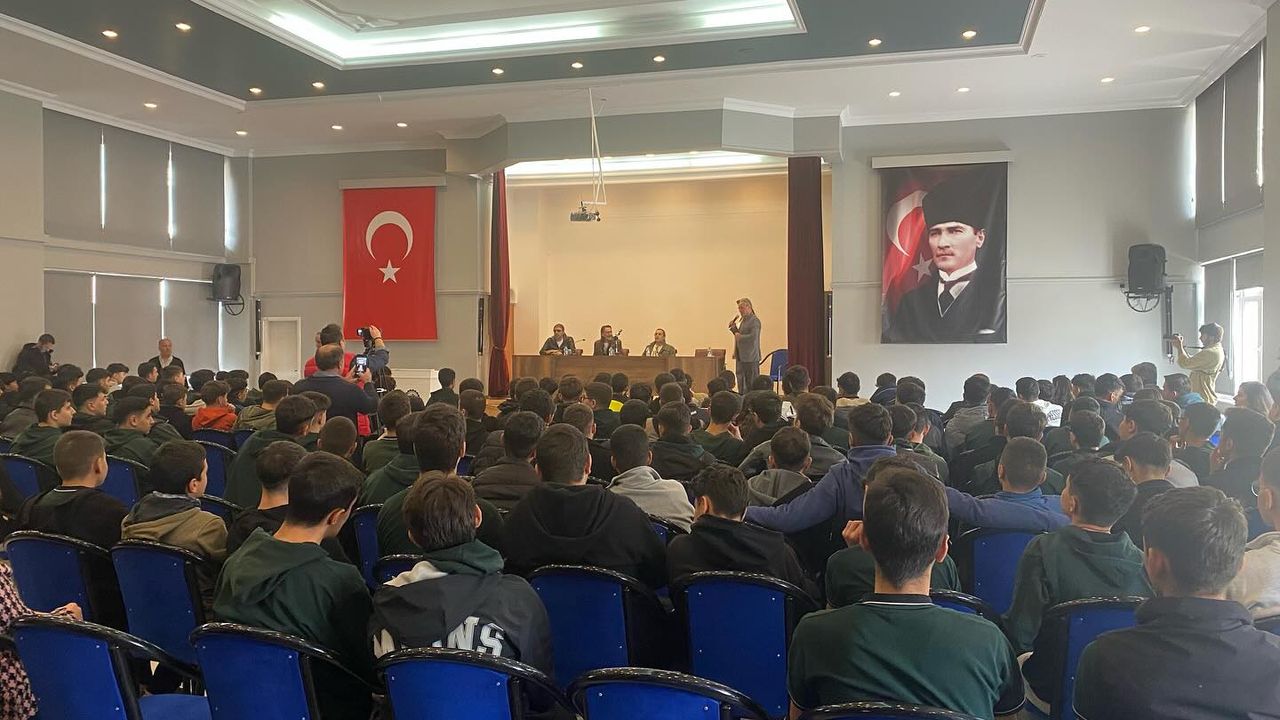 Okulun konferans salonunda düzenlenen söyleşide oyuncular bilgi ve birikimlerini öğrencilere aktardı. Söyleşinin sonunda okul atölyesinde yapılan ahşap üzerinde lazer çizimli oyuncuların fotoğrafları hediye edildi.