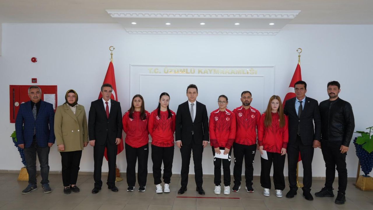 Balkan Şampiyonası’nda büyük bir başarı elde eden sporcular, Üzümlü Kaymakamı Buğra Karadağ’ı makamında ziyaret etti. Ziyarette sporcuları ve antrenörlerini tebrik eden Kaymakam Karadağ, genç sporculara başarılarının anısına hediye çeki takdim etti.