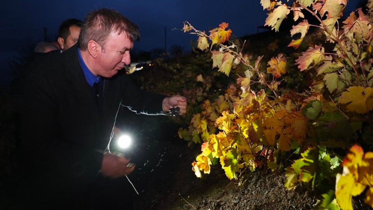 Akşam saatlerinde bir bağa cep telefonlarının fenerleriyle giren Vali Aydoğdu ve beraberindekiler, karanlık baranların arasında kalan son üzüm salkımlarını bulmak için arama yaptı. Soğuk havaya rağmen keyifli anlara sahne olan ziyarette, Vali Aydoğdu uzun arayışın ardından bağda kalan son salkımlardan birine ulaşmayı başardı.