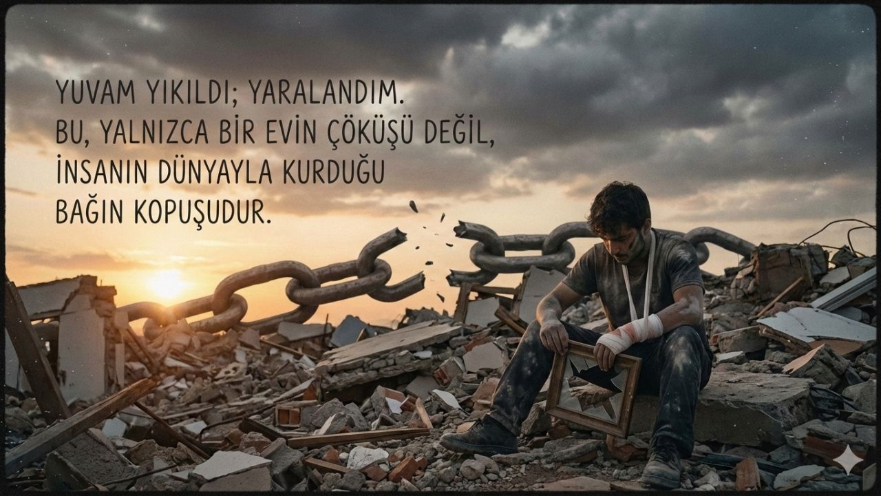 Yuvam yıkıldı; yaralandım. Bu, yalnızca bir evin çöküşü değil, insanın dünyayla kurduğu bağın kopuşudur; enkazın altında kalan sadece taşlar değil, hatıralar, emekler ve adalet duygusudur.